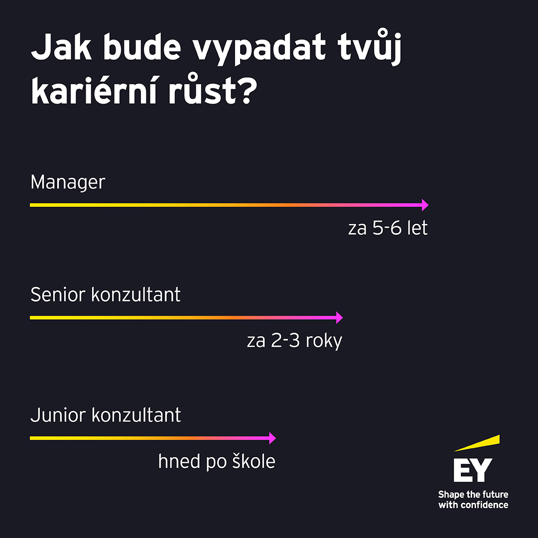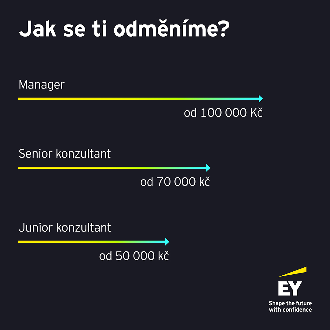 Když nastoupíš, přesně víš, na jakou pozici se dál posuneš a jak dlouho to obvykle trvá. A aby bylo odměňování v EY stejně přehledné jako kariérní růst, vytvořili jsme pro tebe jednoduchou infografiku. Mrkni, kolik dostaneš při nástupu a kolik si můžeš vydělat jako Senior konzultant nebo Manager v budoucnu.